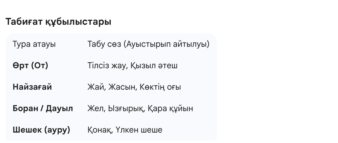 Қорытынды: Бұл сөздердің барлығы экологиялық тәрбиенің негізі болып табылады. «Табу» сөздер арқылы ата-бабамыз балаларын табиғатты аялауға, қауіпсіздікті сақтауға үйреткен.